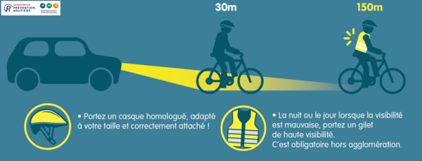 Concernant l’équipement du cycliste, il est indispensable de choisir la bonne tenue pour rester visible. Sans vêtement réfléchissant, un cycliste est visible à 30 mètres de la voiture seulement, contre 150 mètres avec le gilet de haute visibilité. Son utilisation est obligatoire la nuit, hors agglomération. Il est également recommandé de porter un casque homologué et correctement attaché.