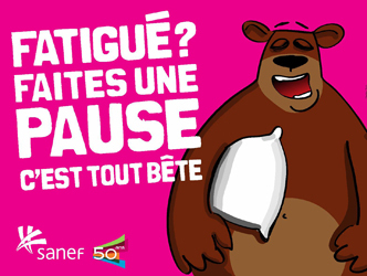 Visible un peu partout sur les axes routiers de la région, une affiche colorée met en avant un ours en train de bâiller, avec un oreiller sous le bras. Le slogan : "Fatigué ? Faîtes une pause, c'est tout bête".