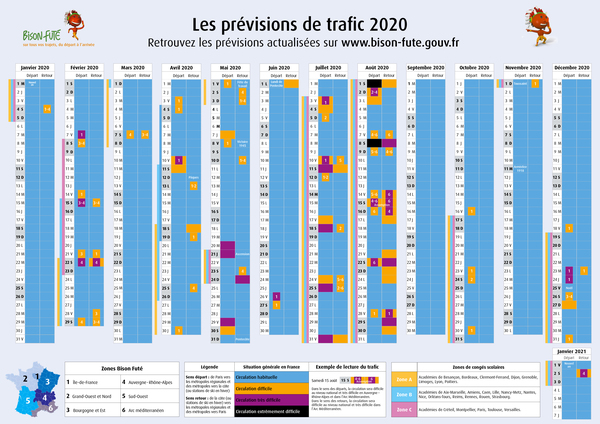 En France, environ 4 % de personnes sont atteintes de daltonisme (8 % d’hommes et 0,5 % de femmes). Bison Futé a adapté les couleurs de son calendrier prévisionnel 2020 de la circulation routière pour faciliter la lecture de ce dernier par les daltoniens. Pour la deuxième année consécutive, les daltoniens peuvent désormais accéder à une version du calendrier comprenant un code couleur différent.