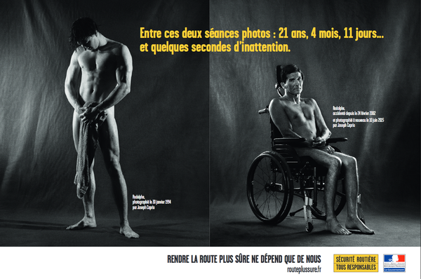 Plus de vingt ans plus tard, Rodolphe a souhaité raconter son histoire pour sensibiliser les jeunes aux dangers de l’alcool au volant. Il a donc décidé de rappeler son photographe de l’époque, Joseph Caprio pour réaliser un nouveau cliché de son corps, cette fois-ci dans un fauteuil roulant… Le message de la campagne est fort « Entre ces deux séances photos : 21 ans, 4 mois, 11 jours et quelques secondes d’inattention ».