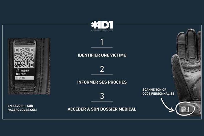 L’entreprise française Racer, spécialisée dans la confection de gants de moto, vient d’intégrer à certains de ces gants un QR Code ID1. Ce QR Code renferme un certain nombre de données personnelles et médicales : personne à contacter en cas d’urgence, historique médical, allergies, traitements, groupe sanguin… Ses données sont saisies et modifiées directement par le motard. En cas d’accident, les secours peuvent y accéder grâce à une application spéciale du dispositif d’e-santé ID1 (homologué par la Fédération Nationale des Sapeurs-pompiers de France).