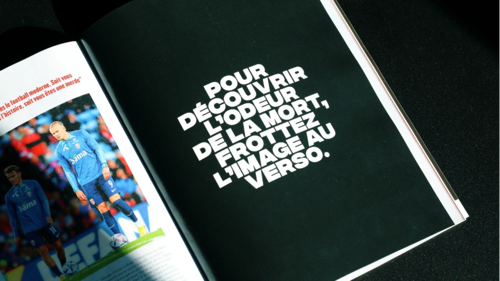 Publiée dans le magazine So Foot, elle s’étend sur une double page et utilise une technologie innovante d’impression olfactive.